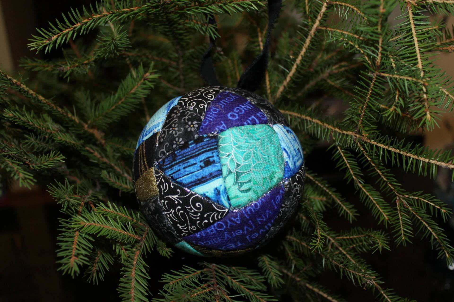 Диаметр шара 12 см. Новогодний шар в черно – синих оттенках станет отличным украшением любого современного новогоднего интерьера. Использованы лоскуточки 100% американского хлопка. Шар украшен серебренным блеском, тесьмой, в единственном экземпляре