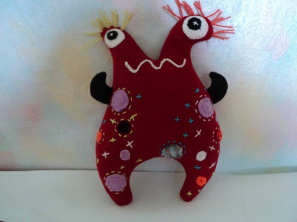 Улыбка Монстра вышита тамбурным швом нитками мулине. Прическа сделана также из ниток мулине. Глаза - два кружочка белого и черного цветов.