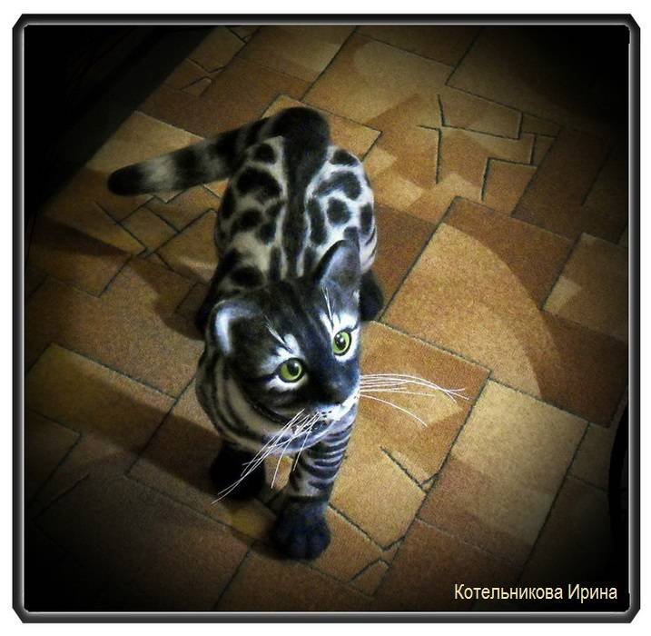 Бенгальский котик- окрас угольный. Сделан из 100% шерсти с применением техники вязания из ниток мохер. Котик на шарнирном каркасе, лапки подвижны. Окрас сделан полностью из шерсти. Глазки расписаны вручную. Размер котика в высоту 37 см, в длину 40 см. Вес котёнка 1,1 кг. Авторская ручная работа.