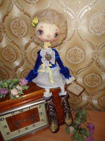 Тело 100% бязь, волосы натуральная шерсть, сапожки сшиты в ручную из натуральной кожи, личико расписано акриловыми красками, одежда не снимается.