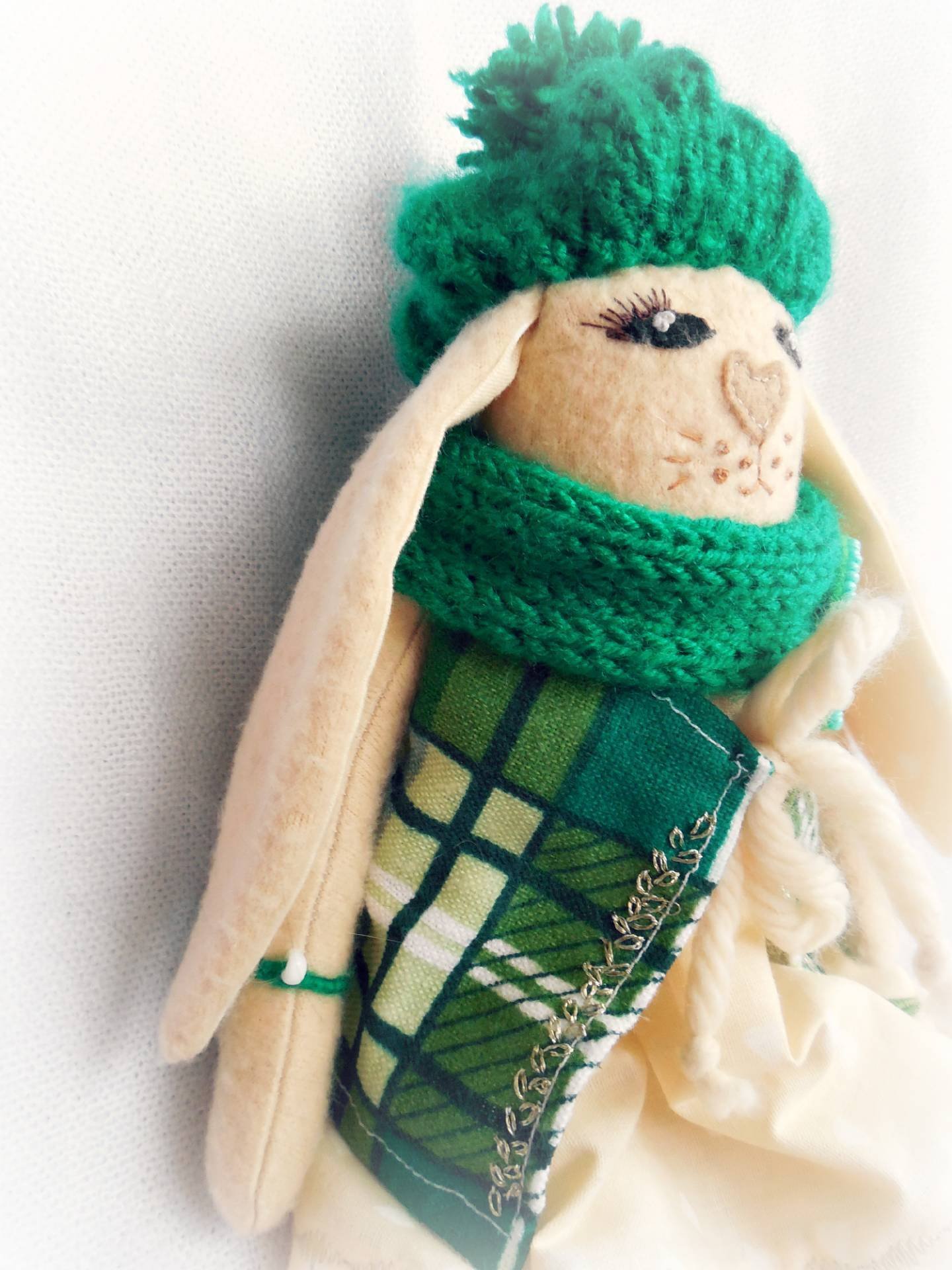 Она милая и очаровательная, ее взгляд глубокий и задумчивый, но очень нежный. В этой шапочке у нее довольно трогательный вид, не оставляющий никого равнодушным. Она может стоять и сидеть. Детальная одежка и мордочка, несколько грамм счастья. На шарфике - брошь с вышивкой и бисером.
