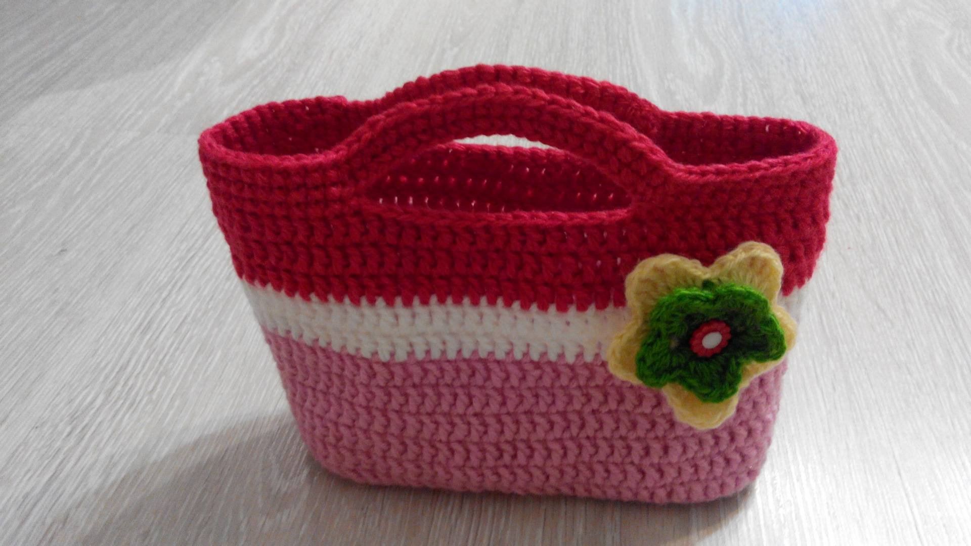 Детская сумочка связана крючком из акриловой пряжи. Украшена вязаным цветком и пуговкой. Высота сумочки вместе с ручками 17см, ширина 23см. Прекрасный подарок для маленьких принцесс.