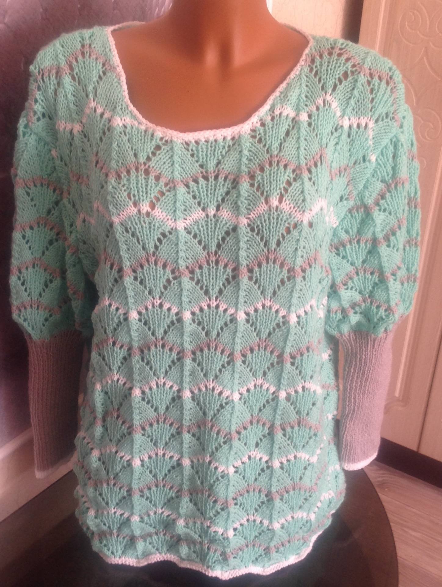 Джемпер мятного цвета связанный спицами с необычными рукавами отлично смотрится в комплекте с брюками и с юбкой