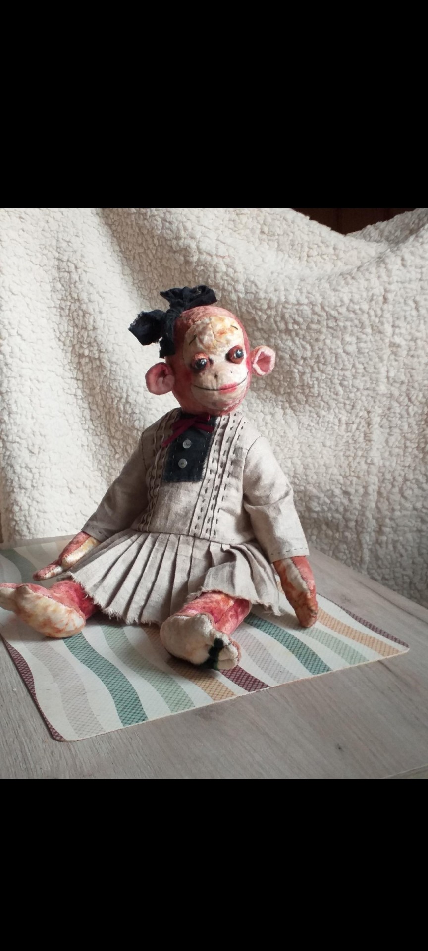Эта малышка сшита из старинного плюша 60-х годов,окрашеного вручную. Выполнена по мк Елены Кукузей,замечательного мастера. Ручки,ножки и головушка на шплинтовом креплении,набита опилочками и синтепухом. Платьице и панталончики съемные,сшиты из льна и бязи. Глаза-ручная работа и роспись. Выполнена полностью вручную. Эта девочка ищет свою хозяйку или хозяина,и с удовольствием переедет в новый дом.