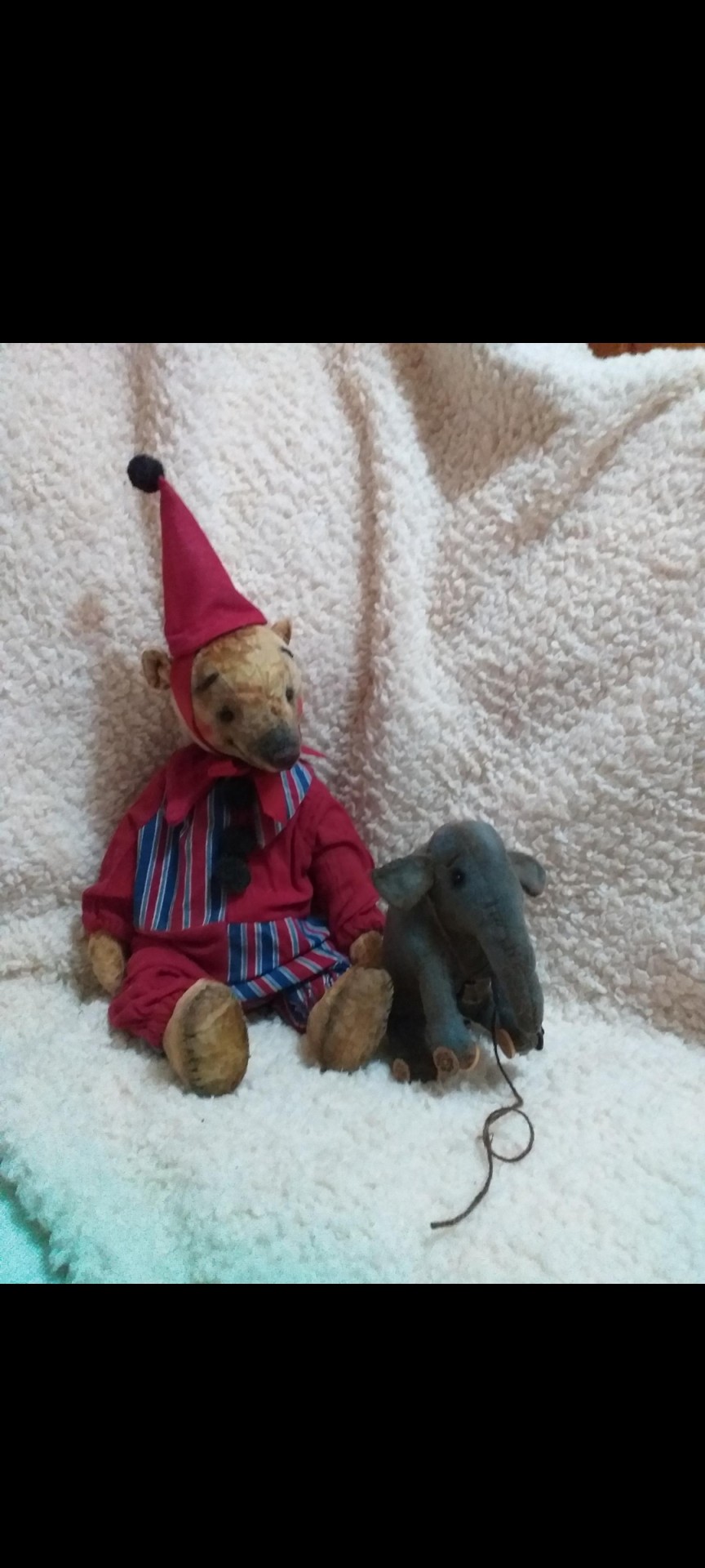 Мишка из прошлого))). Люблю игрушки с историей ,как из детства,состаренные,пусть и вручную,но такое тепло исходит,когда держишь на руках подобного медведика или слона или еще какую-нибудь куклу или игрушку. Этот миша родился давно,но не хотел фотографироваться),то одежда не та,то ему игрушку подавай,то ракурс не тот,корче -намучилась с ним. Но все таки он нашел время и было у него хорошее настроение видимо),разрешил его запечатлеть. Рост этого господина 52 см в колпаке. Очень любит цирк,сам не выступает,но ходит в клоунком костюме. А еще у него есть его любимый слоник,везде и всюду он с ним,не разлей вода короче. Сшить из винтажного плюша окрашенного вручную .И тот и другой из этой парочки,набит березовыми опилками,одежда и колпак съемные. Что не мало важно для детей ! Тельце мишуни на шплинтовом креплении. Утяжелен гранулятом,что придает приятную увесистость,когда держишь мишку в руках. Ищет новый дом и любящих хозяев.