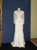 Платье размера 44-46 (рост 174-177 см) прилегающего силуэта и завышенной талией, с небольшим шлейфом. Из нежнейшего шелка Армани белого цвета и молочного Шантильи, сшитое на 70% вручную, украшенное стразами Сваровски, пайетками и вышивкой кружевом.