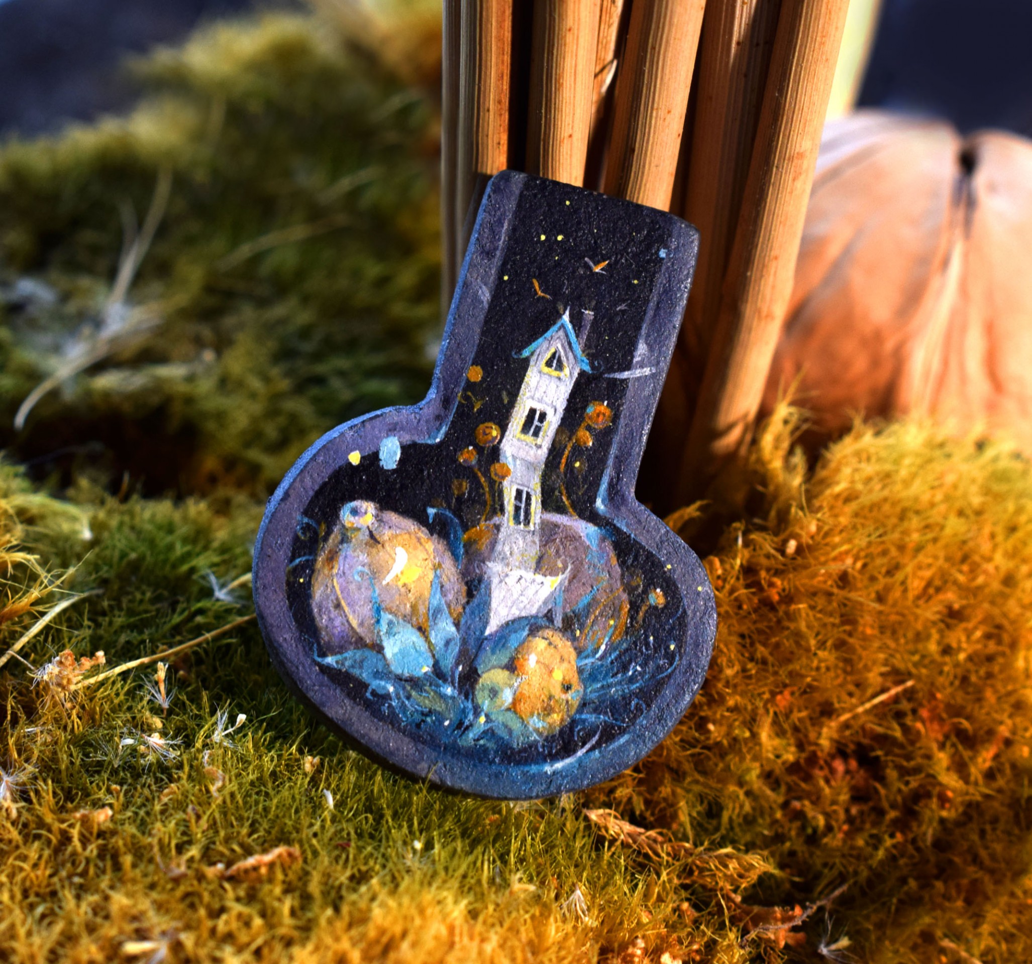 Брошь ручной работы с использованием акварели и белой гуаши. А покрыто все акриловым аэрозольным лаком. Основа - спресованная древесная стружка. 3,5х2,5 см. Крепление стандартное, металлическое.