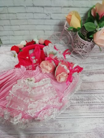 Платье сшито из велюра,отделано кружевом,по кружеву идут полубусины жемчужные. К платью прилагается воротничок,рукава кружевные,.Нижняя юбка и штанишки сшиты из хлопка, отделаны кружевом и атласной лентой. На куколке колготочки и ботиночки, тоже сшиты мной. Ботиночки сшиты из натуральной кожи,окрашены акриловой краской по коже,украшены кружевом и цветком. На голове веночек,тоже сделан мной в единственном экземпляре. Всю одежду можно снять! Или сшить другой гардероб! Голова у куколки поворотная, поэтому она умеет смотреть по сторонам.